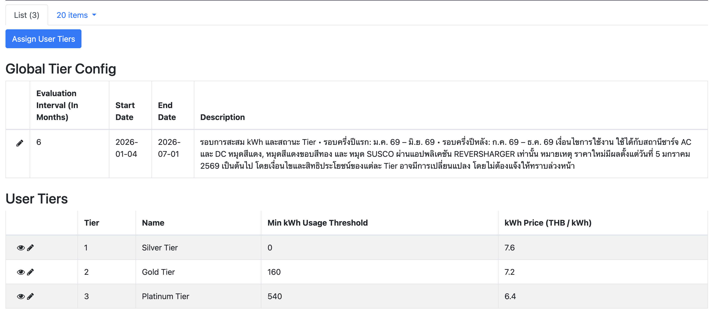 - User Tiers จะเป็นการกำหนดเกณฑ์การได้มาซึ่ง Tier นั้นๆ โดยสามารถกำหนดเป็นจำนวน kWh, ส่วนลดประจำ Tier นั้น ๆ การกำหนด Evse group ที่จะสามารถใช้ Tier ได้